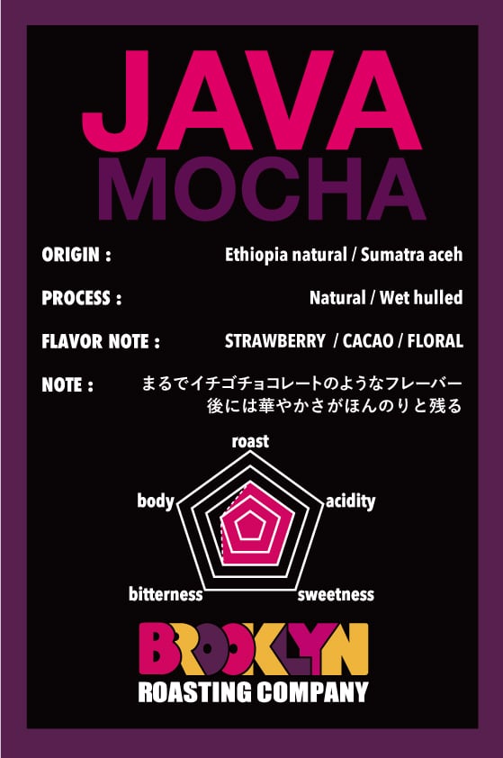 あの歴史的に有名なコーヒーのブレンド "Mocha Java " を更にアップデートしたブルックリンスタイルの新しいブレンドです。 土壌の香りがするしっかりとしたボディー感の中に、フルーツのフレーバーを程よく感じ、後味には特徴的なカカオの香りを感じます。⿊糖のようにコクのある⽢い⼝当たり。⼝当たりの質感温度が下がるにつれて若々しいフレッシュなベリーのテイストが出てきます。